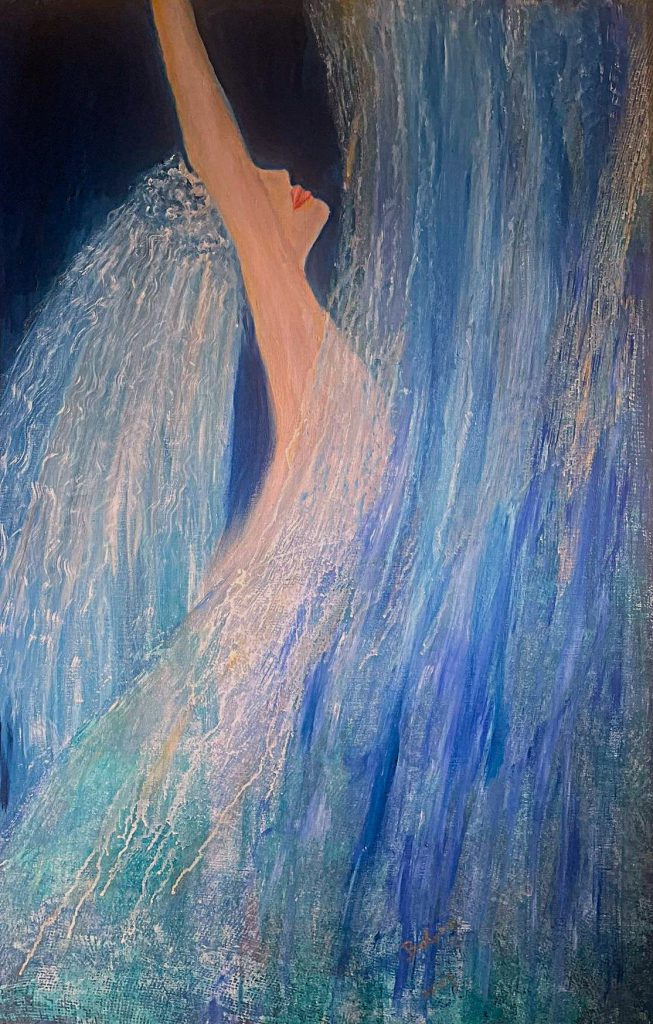 Szczególnym motywem jest obraz przedstawiający sylwetkę zanurzoną w strumieniu światła i wody – moment przejścia między formą a jej zanikiem, między ciężarem a lekkością.