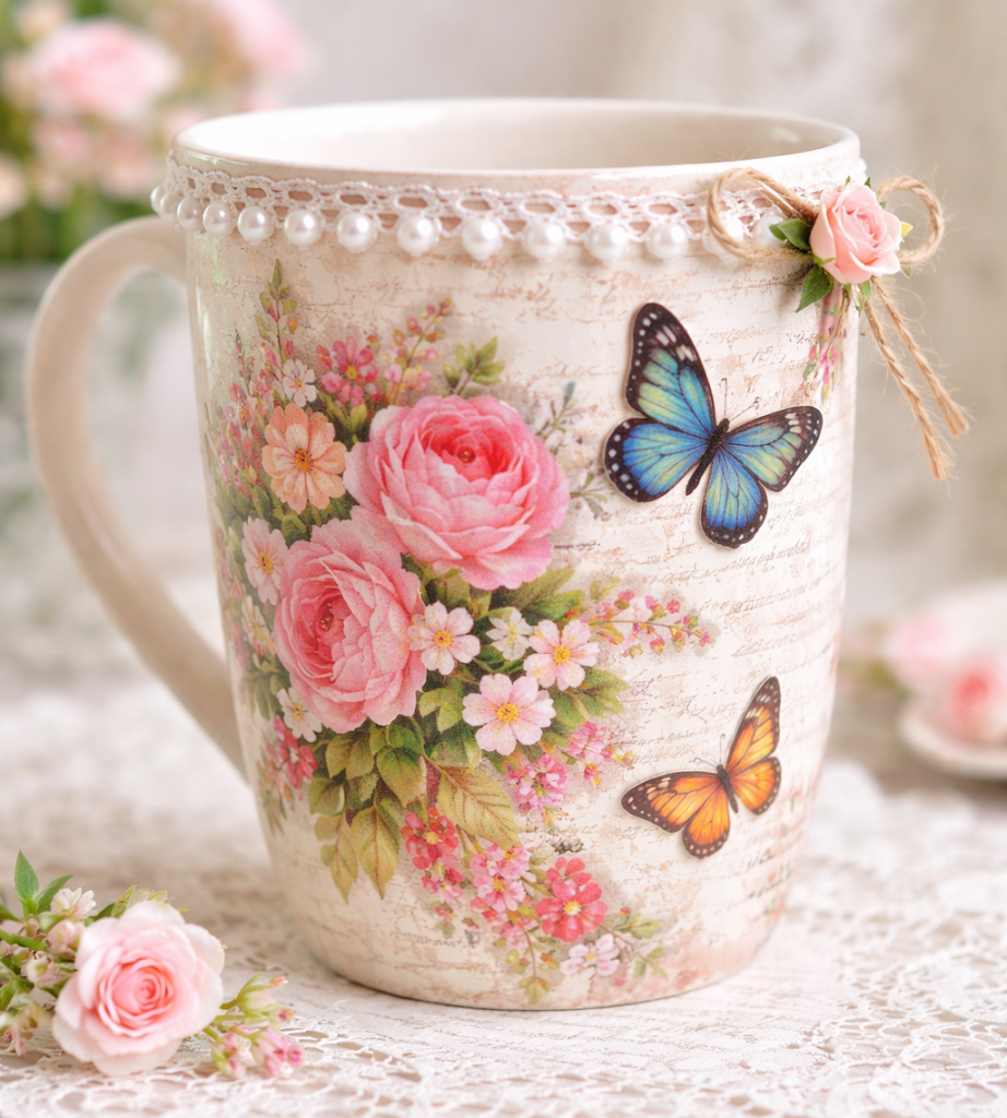 za pomocą techniki decoupage. Będziemy ozdabiać ceramiczne kubki.