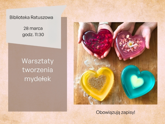Zapraszamy dzieci wraz z rodzicami do Biblioteki Ratuszowej na kreatywne warsztaty tworzenia mydełek. To świetna okazja do wspólnego spędzenia czasu i rozwijania wyobraźni poprzez własnoręczne tworzenie pachnących, kolorowych kosmetyków naturalnych.