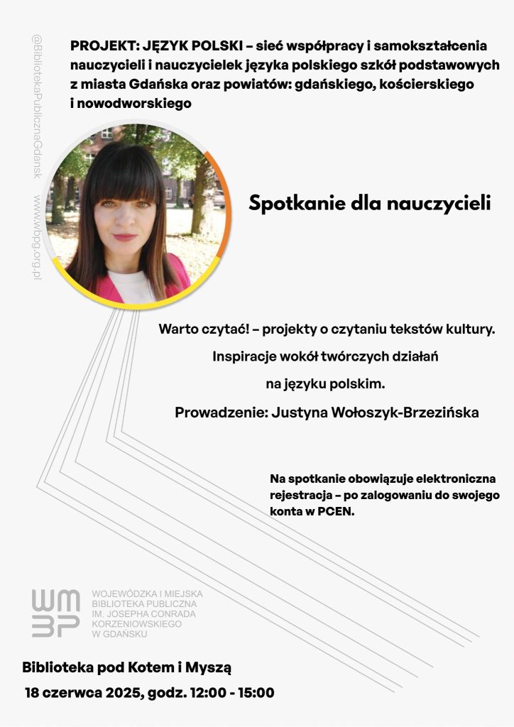 Sieć współpracy i samokształcenia pn. PROJEKT: JĘZYK POLSKI to cykl spotkań dla nauczycieli i nauczycielek języka polskiego szkół podstawowych z miasta Gdańska oraz powiatów gdańskiego, kościerskiego i nowodworskiego.